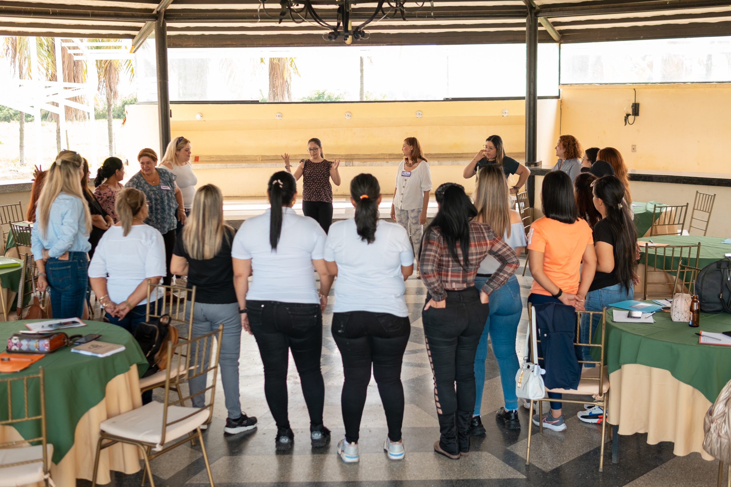 Antes de iniciar su ponencia, Karol Moreno, directora de la Red Mérida Feminista, llevó a cabo una dinámica con las asistentes para ejemplificar cómo funciona el tejido social y la importancia de la sororidad e interseccionalidad, haciendo referencia a que, aunque las mujeres tengan posiciones distintas, cuando una mujer vive una situación de desigualdad esto afecta a las mujeres en su conjunto. De igual manera, cuando dos o más mujeres se apoyan para crecer, incide también en las mujeres que están alrededor. El objetivo de la dinámica fue crear conciencia sobre la importancia de trabajar en redes para superar las desigualdades estructurales.